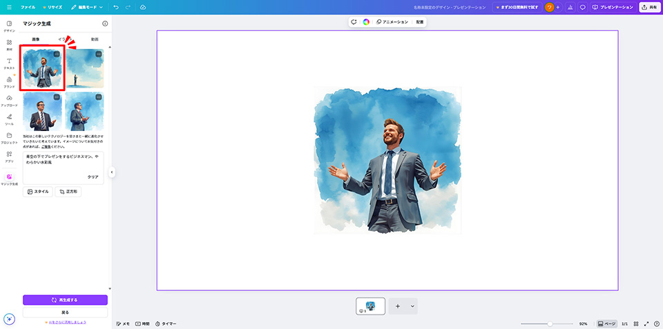 例:「青空の下でプレゼンをするビジネスマン、やわらかい水彩風」